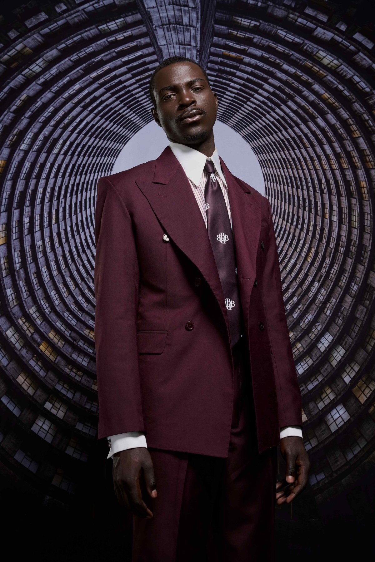 Structured double-breasted jacket in a rich burgundy wool blend, refined through sharp lines and balanced proportions.