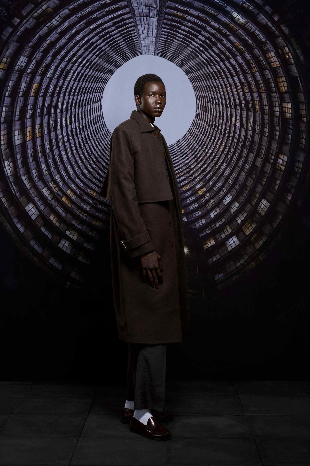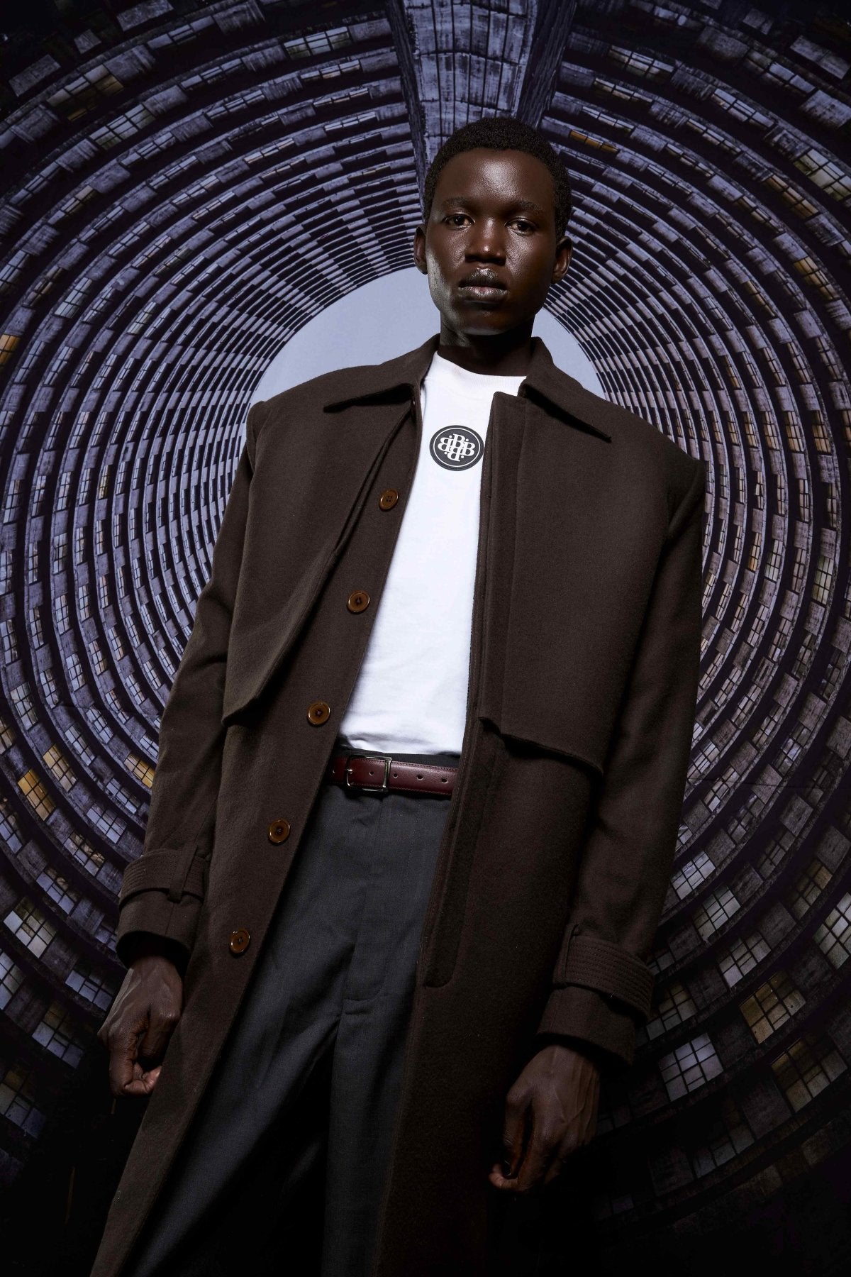 Single-breasted felt wool trench coat with storm flaps, delivering warmth, structure, and a commanding presence.